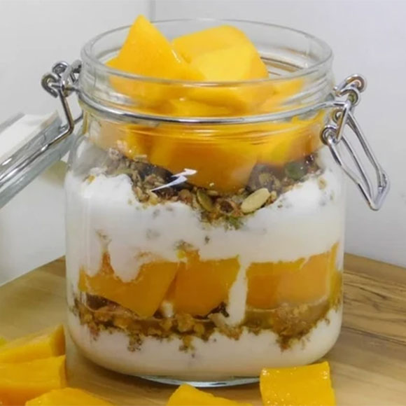 layers from our healthy granola and greek yogurt with honey and topped with fruits
